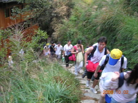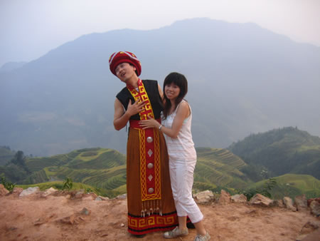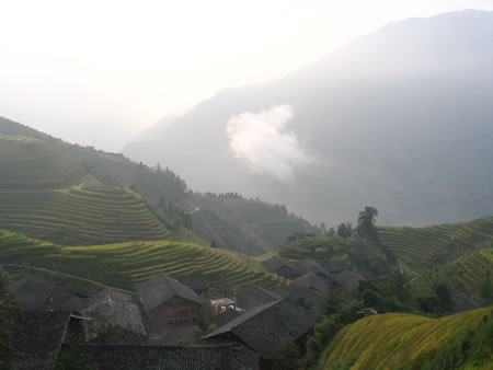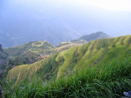 龍勝的梯田風光乃世界又一大景觀,春夏秋冬其景觀各不相異.在這金秋時節(jié),整個梯田山上金黃的麥穗一片,形成一片浩瀚的海濤景色圖.經(jīng)過4個半的車程&1個鐘的攀越,終于將龍勝梯田秋之景一覽于腳下.