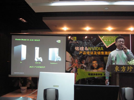 緊接著NVIDIA高級渠道銷售經理陳祖旋先生現場介紹了NVIDIA公司產品線路發展計劃。除了對陰影渲染優化(SM3.0)、高精度動態渲染(HDR)和超級顯卡并聯(SLI)等NVIDIA最新顯卡技術做了詳細講解外,還重點介紹了NVIDIA先進的Purevideo視頻技術,目前NVIDIA旗下高端Geforce7800系列產品的Purevideo視頻技術,已為用戶提供了高達1080P高清晰度視頻,表示Purevideo視頻技術將成為NVIDIA在2006年重點發展的技術,將會讓更多終端用戶體會到高質量的家庭娛樂享受。針對2005年下半年NVIDIA顯卡產品供貨緊張的狀況,陳先生表示,目前NVIDIA能夠針對中高端顯卡產品提供足夠的現貨供給,2006年NVIDIA更多主力顯卡產品將會采用技術先進的90納米制程工藝,90納米技術在芯片能耗,成本,以及產能方面的綜合優勢,將會幫助NVIDIA為用戶提供足夠的芯片供應。