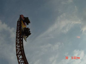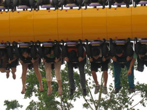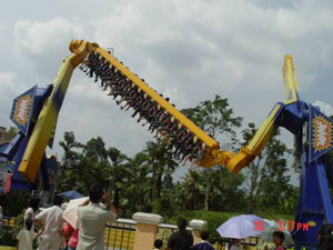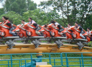 十環(huán)過(guò)山車 最聲名顯赫的游戲,亞洲首臺(tái)、全世界第二臺(tái)(僅在英國(guó)有一臺(tái))、單項(xiàng)設(shè)備投資超過(guò)人民幣一億元,打破游樂(lè)設(shè)備環(huán)數(shù)最多的世界記錄,并創(chuàng)造了世界吉尼斯記錄。