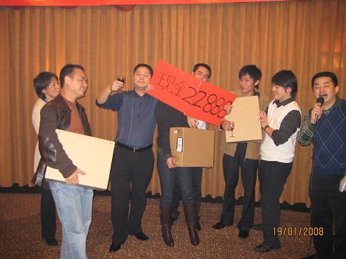 大家都吃喝的差不多的時候,大會最令人興奮的頒獎及抽獎活動便拉開了帷幕。商科廣州分公司為本次大會準備了現金大獎、名牌筆記本、高檔DV及相機、臺電MP3、臺電攝像頭等在內的豐富獎品。由商科集團市場部經理 陳濤女士頒發第一組2007年“年度優秀代理商”,共六名。