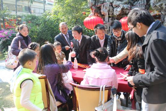 整個(gè)會(huì)場內(nèi)外都布置的很漂亮,花園里掛著許多燈謎,答對燈謎的人就可以領(lǐng)到小禮品,大家紛紛開動(dòng)腦筋絞盡腦汁,場面十分熱鬧。