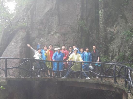 結(jié)束語:雖然本次旅游的時間由于客觀原因推遲了一些, 途中還下了點小雨,但是這些都沒有影響到大家的心情,也許穿著雨衣爬山對于很多同事來說是人生的另一番體驗,額頭上除了汗水還有雨水,溫溫的汗水混合涼涼的雨水,給各自帶來的靈感,只有自己才知道。下山后,晴朗的天氣,依然給了大家一個保持良好心情的理由。人生的旅途,不會一帆風(fēng)順,也總是要經(jīng)歷風(fēng)雨之后才能見晴空,大家在經(jīng)歷風(fēng)雨的時候,請一定要記住,晴空就在前方,祝福大家。