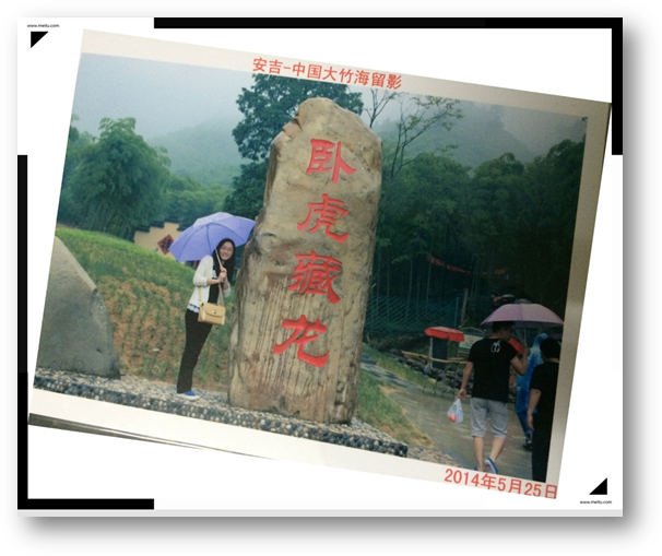 旅行的第二天,我們?cè)趽?jù)說有大雨的天氣中開始了我們的行程。一路上,雨,忽停忽下,有時(shí)還傾盆而下連綿不斷。雖然天公不作美,但我們游玩的心情不減反增,相信在雨中更能體會(huì)到大自然的樂趣,為此,我們便來到了電影《一代宗師》的拍攝地點(diǎn)之一------大竹海。既然是這么有意義的地方,當(dāng)然少不了來一張“全家福”咯。