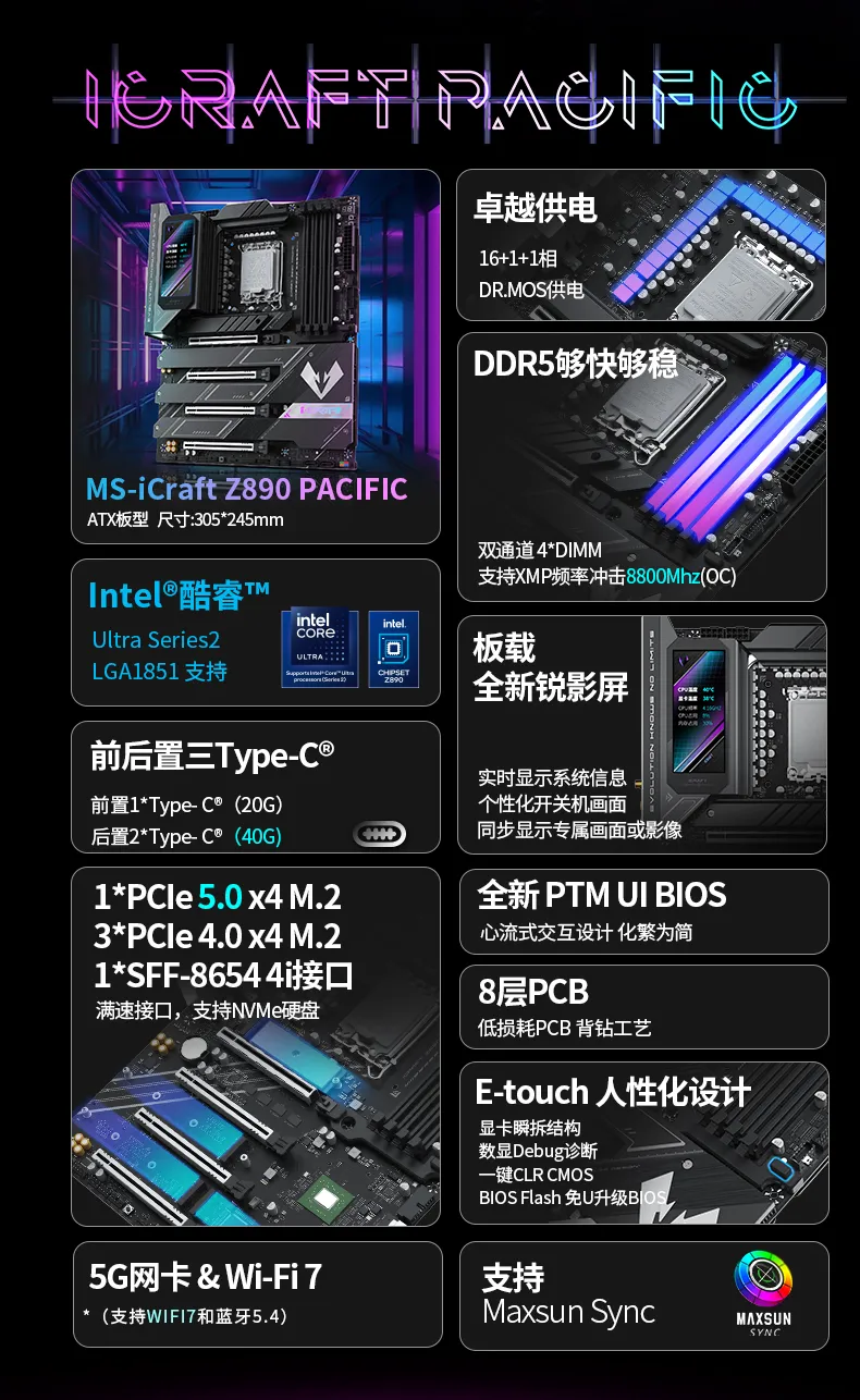 其中,在活動現場也有展出的MS-iCraft Z890 Pacific憑借出色的配置獲得了相當高的關注度。16+1+1相DR.MOS供電的強悍配置,充分發揮CPU潛能,配備4*高速DDR5內存插槽,超頻沖擊8800MHz,8層服務器級PCB有效降低信號損耗、增強信號完整性、助力DDR5高速傳輸。